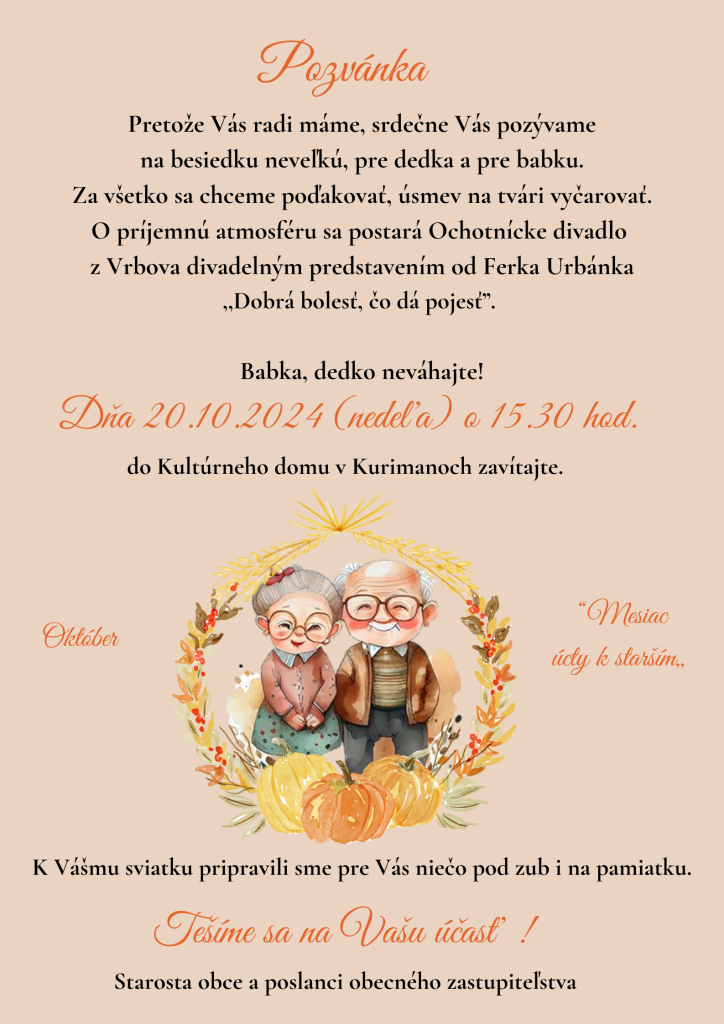 Obec aj tento rok privítala a uctila si seniorov z obce Kurimany kde ako poďakovanie sme si pripravili pre seniorov pohostenie, darček a divadelné predstavenie Ochotníckeho divadla z Vrbova. Na začiatku tejto slávnosti sa prihovoril starosta obce Ing. Martin Faltin